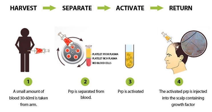 PRP is used in many medical fields such as dentistry, sports medicine, and of course cosmetic surgery. Hair loss clinics use it to treat pattern baldness both in women and men. PRP relies on the collection of the patient’s own blood before the blood goes through two centrifugation processes. The resulting plasma can have a five-fold concentration of platelets than normal blood. PRP contains several types of growth factors (e.g. epidermal growth factor, insulin-like growth factors, connective tissue growth factors, etc.), which are believed to stimulate dormant hair follicles to resume their growth. PRP works by injecting the platelet enhanced plasma into the patient’s scalp.